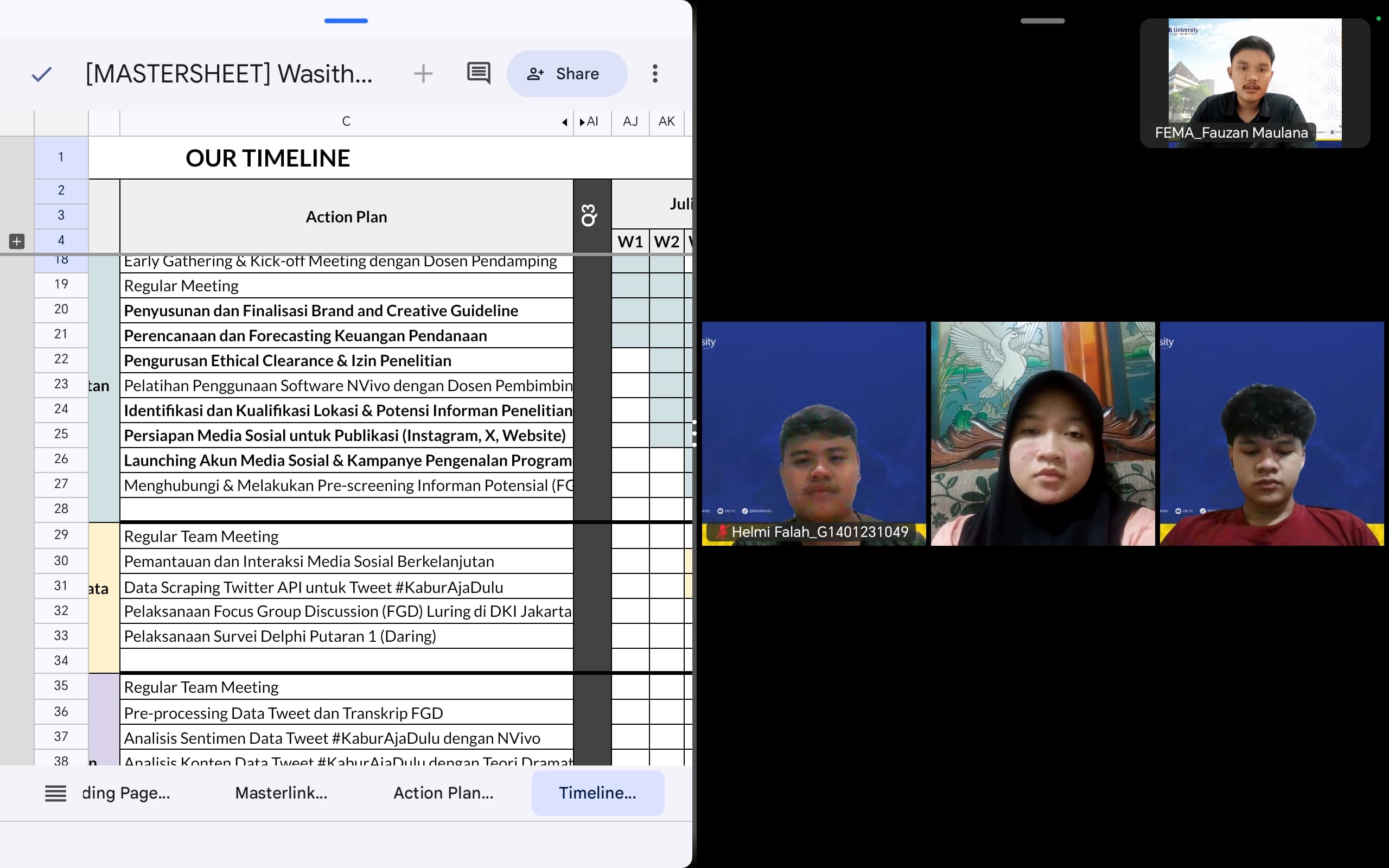 Awal Juli menjadi momen penting bagi Tim GenKaburAjaDulu setelah menerima kabar lolos pendanaan PKM-RSH 2025. Pertemuan perdana yang berlangsung pada 7 Juli menandai dimulainya fase persiapan riset dengan penuh antusias. Dalam suasana diskusi virtual yang intens, tim membentuk timeline pelaksanaan program, membagi tugas sesuai bidang keahlian, dan menyusun rencana aksi bulan pertama. Keesokan harinya, tim langsung mengadakan konsolidasi dengan dosen pembimbing untuk mematangkan metodologi serta menyelaraskan arah riset agar sesuai dengan standar akademik PKM IPB.Arahan dosen pendamping pada tahap ini menjadi fondasi awal pembentukan struktur kerja tim yang sistematis. Selain pertemuan formal, tim juga mulai menyusun dokumen timeline di Google Sheets dan mengatur sesi koordinasi mingguan, sehingga komunikasi dan pembagian tugas berjalan lebih lancar.