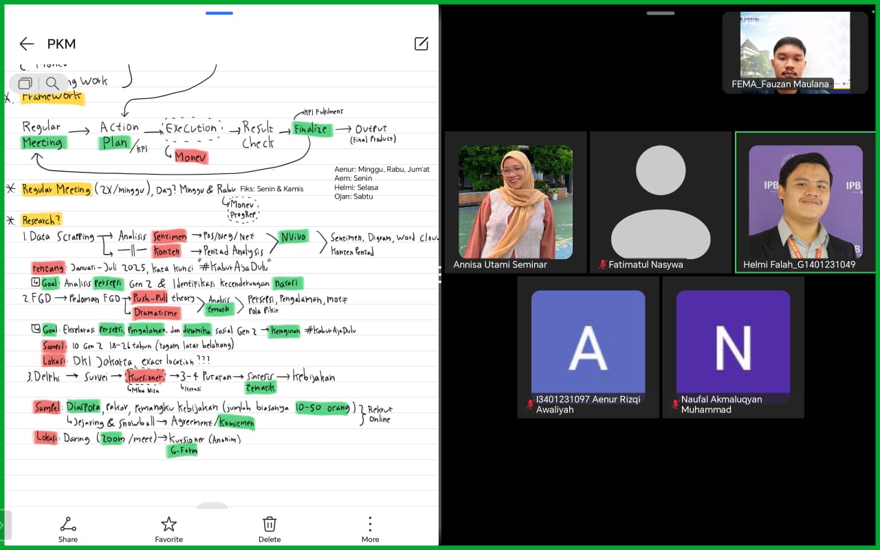 Awal Juli menjadi momen penting bagi Tim GenKaburAjaDulu setelah menerima kabar lolos pendanaan PKM-RSH 2025. Pertemuan perdana yang berlangsung pada 7 Juli menandai dimulainya fase persiapan riset dengan penuh antusias. Dalam suasana diskusi virtual yang intens, tim membentuk timeline pelaksanaan program, membagi tugas sesuai bidang keahlian, dan menyusun rencana aksi bulan pertama. Keesokan harinya, tim langsung mengadakan konsolidasi dengan dosen pembimbing untuk mematangkan metodologi serta menyelaraskan arah riset agar sesuai dengan standar akademik PKM IPB.Arahan dosen pendamping pada tahap ini menjadi fondasi awal pembentukan struktur kerja tim yang sistematis. Selain pertemuan formal, tim juga mulai menyusun dokumen timeline di Google Sheets dan mengatur sesi koordinasi mingguan, sehingga komunikasi dan pembagian tugas berjalan lebih lancar.