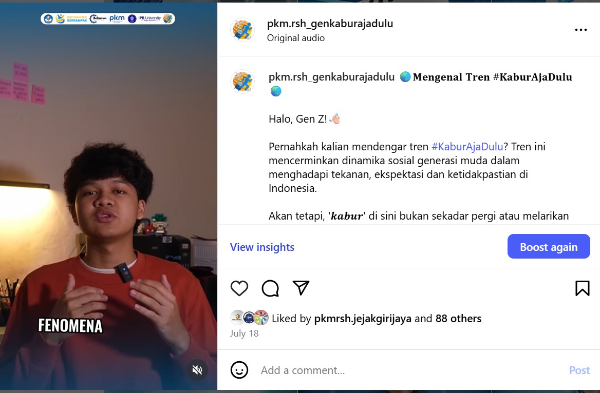 Di tengah kesibukan akademik, tim juga mulai membangun identitas publiknya. Melalui koordinasi desain internal, pada 11–12 Juli tim menyelesaikan proses pembuatan logo resmi GenKaburAjaDulu yang melambangkan semangat generasi muda menghadapi dinamika sosial. Logo ini kemudian menjadi dasar dalam strategi publikasi digital, diikuti dengan pembuatan konten “Coming Soon”, overview program, hingga team reveal di media sosial. Seluruh aktivitas tersebut tidak hanya memperkenalkan riset kepada khalayak, tetapi juga memperkuat rasa kebersamaan dan profesionalitas tim. Setiap unggahan dirancang dengan mempertimbangkan citra akademik dan daya tarik visual agar dapat menjembatani dunia riset dan publik secara komunikatif.