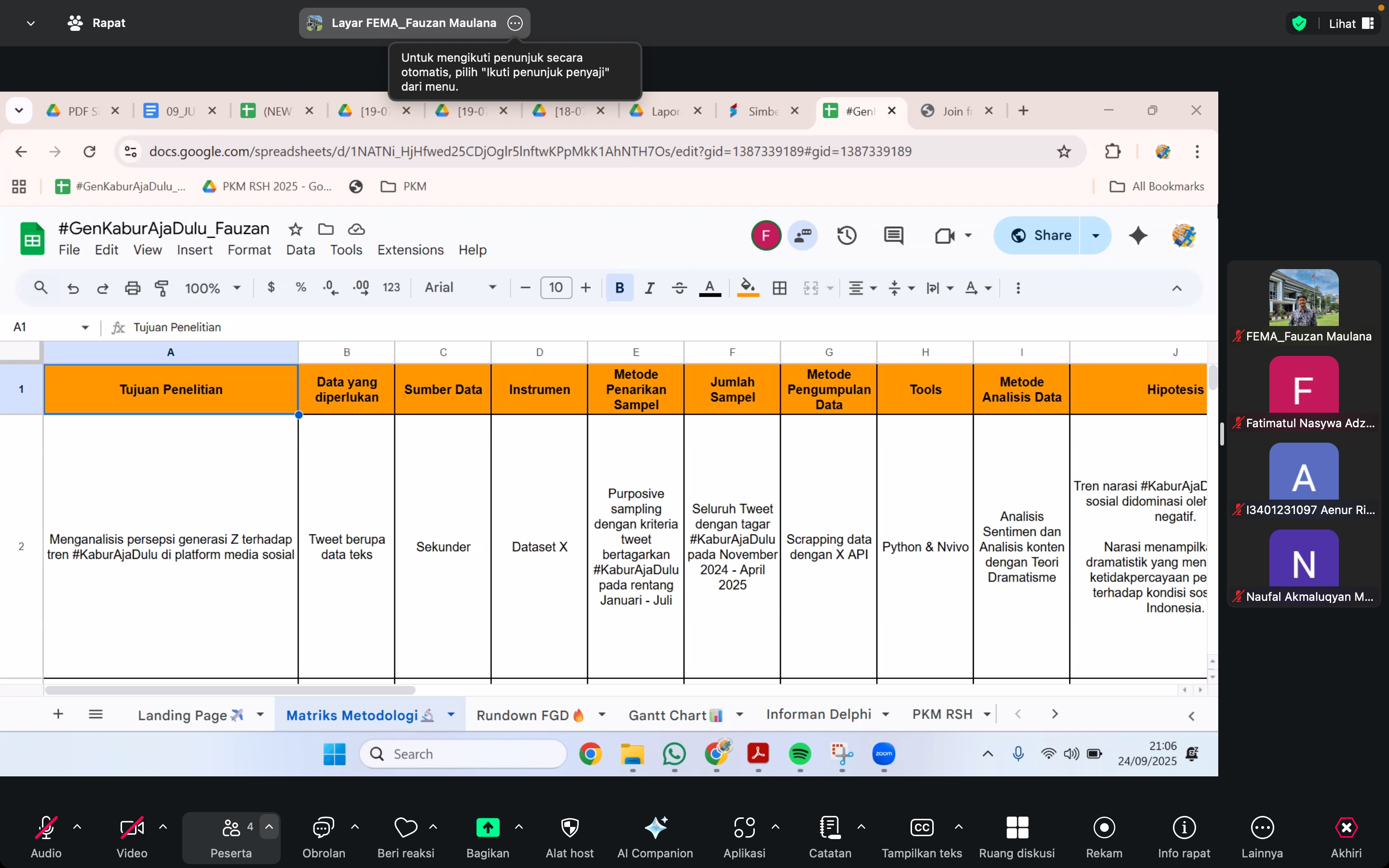PMenjelang akhir Juli, tim mengadakan serangkaian coaching bersama dosen pembimbing dan reviewer untuk meninjau kesiapan penelitian. Melalui diskusi ini, metode FGD dan survei Delphi difiksasi menjadi instrumen utama riset, lengkap dengan arahan teknis mengenai jumlah informan, bentuk pertanyaan, dan alur pelaksanaan tiga putaran Delphi. Aktivitas penutup bulan meliputi penyusunan template live report dan repost Instagram untuk pelaporan publik, serta pembuatan video edukatif tentang teori dramatistik sebagai sarana diseminasi ilmiah. Dengan berakhirnya bulan Juli, tahap persiapan riset dapat dikatakan tuntas—tim telah menyiapkan fondasi akademik, teknis, dan etis yang matang untuk memasuki fase pengumpulan data di bulan berikutnya.
